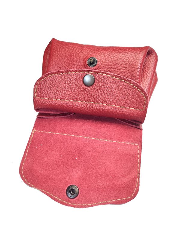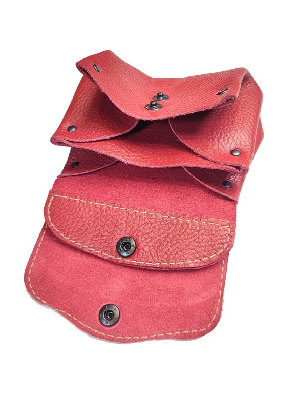 Компактный кошелек, состоящий из трех объемных отделений, закрывающихся двумя карманами-клапанами с механическими кнопками.